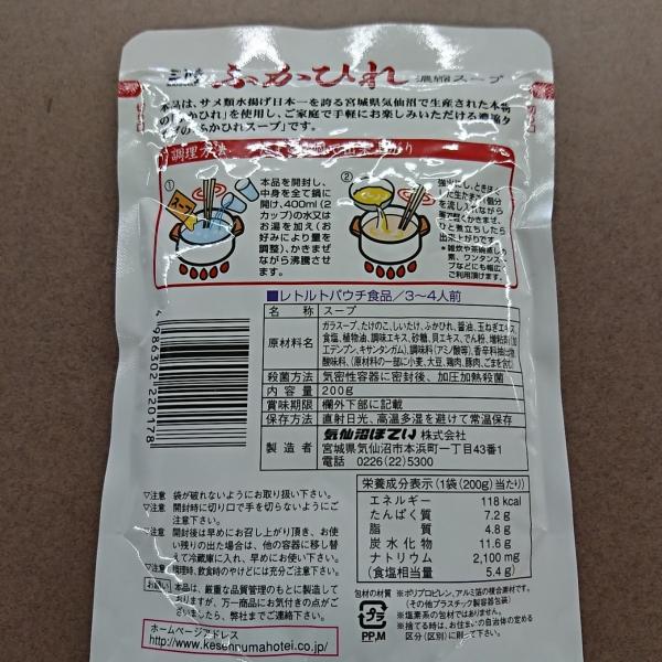 三陸気仙沼産のふかひれを100%使ったスープです。手軽に水を加えて玉子を入れて煮込むだけで作ることができます。1袋で3〜4人前です。レトルトタイプなので日持もします。