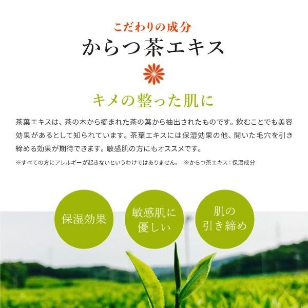 世界緑茶コンテストで金賞を受賞したこともある、良質な唐津産のお茶から抽出した"からつ茶エキス"を配合して作りました。さが美人からつ茶化粧水のご使用で、開いた毛穴をひきしめ、キメの整った肌へと導きます。