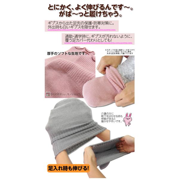 ケガや骨折などでギプス装着した際の足先の寒さや汚れなどをカバーしてくれる靴下です。