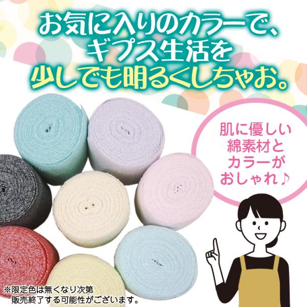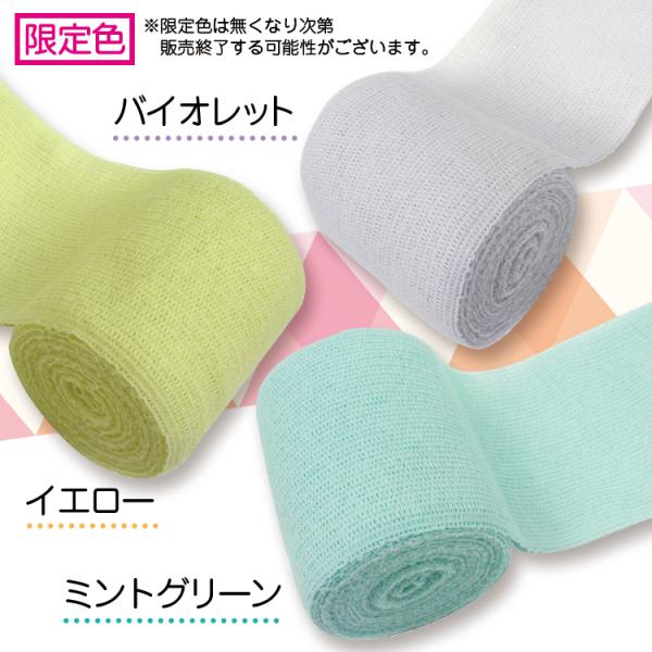 カラー包帯は、染料を使用して染めています。染色後に余分な染料を洗い流すため、包帯の風合いをそのまま残すことができます。洗濯にも強いので、汚れてしまっても、繰り返し洗ってご使用いただけます。(お洗濯の際はネットを使用し、陰干ししてください)ソフトなゴムを使用し同じ幅で伸び縮みするので巻きやすく・ズレることもない、通気性と吸汗性を兼ね備えた肌に優しい綿素材の包帯です。ファッション性も兼ね備えたおしゃれなカラー包帯が患部も心も癒します♪