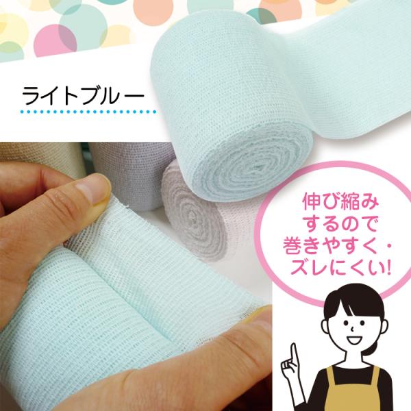 通気性と吸汗性を兼ね備え、ソフトなゴムを使用した伸縮包帯です。肌に優しい綿素材とカラーがお洒落な包帯。
