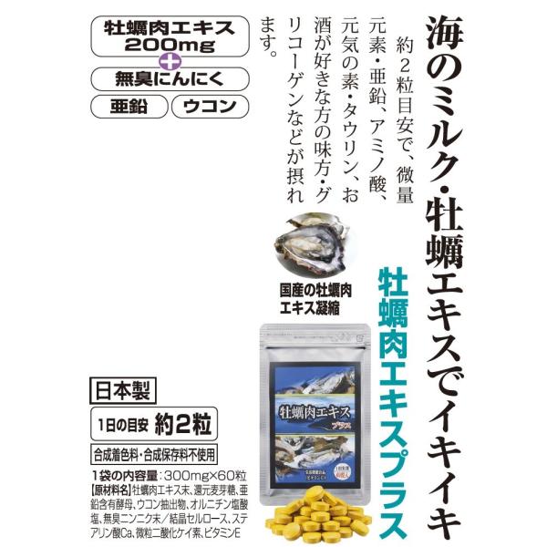 1袋の内容量:300mg×60粒【原材料名】牡蠣肉エキス末、還元麦芽糖、亜鉛含有酵母、ウコン抽出物、オルニチン塩酸塩、無臭ニンニク末/結晶セルロース、ステアリン酸Ca、微粒二酸化ケイ素、ビタミンE※アルミ袋でのお届けになりますほほえみ元気クラブ