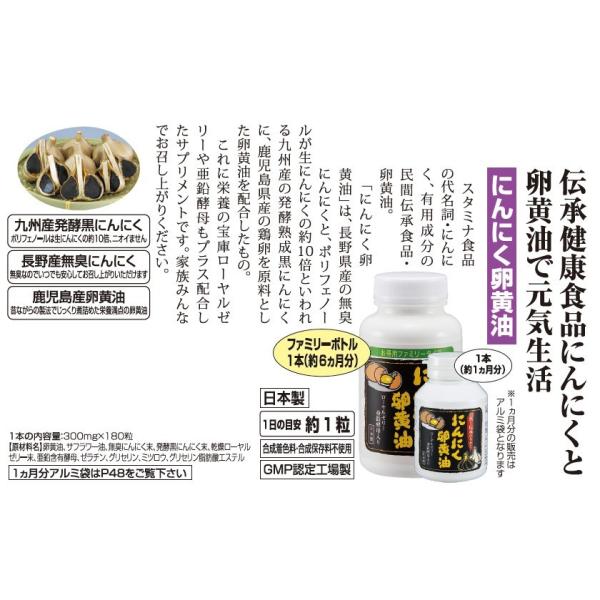 ■1本の内容量:300mg×180粒■【原材料名】卵黄油、サフラワー油、無臭にんにく末、発酵黒にんにく末、乾燥ローヤルゼリー末、亜鉛含有酵母、ゼラチン、グリセリン、ミツロウ、グリセリン脂肪酸エステルほほえみ元気クラブ