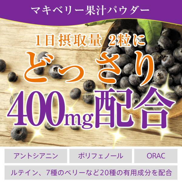 【原材料名】マキベリー果汁パウダー(マキベリー果汁、デキストリン、粉末モミガラ)(チリ製造)、果汁混合末(デキストリン、ブルーベリー果汁、ブラックカーラント果汁、レッドラズベリー果汁、アロニア果汁、リンゴンベリー果汁、アサイーエキス)、マリーゴールドエキス(ルテイン配合)、メグスリノキエキス、ビルベリーエキス、アイブライトエキス、ヤツメウナギエキス/結晶セルロース、ステアリン酸カルシウム、微粒二酸化ケイ素、ヘマトコッカス藻色素、V.B2、ナイアシン、パントテン酸カルシウム、V.B_、V.B_、V.E、V.A、V.B__、(一部にゼラチンを含む)