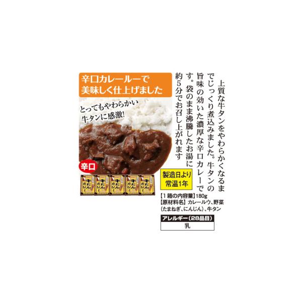 ●カレールウ、野菜(たまねぎ、にんじん)、牛タン、カレー粉、砂糖、小麦粉、コーン油、こしょう、調味料(アミノ酸等)、カラメル色素、乳化剤、増粘剤(グァーガム)、酸味料、香料、香辛料、(原材料の一部 に乳を含む)