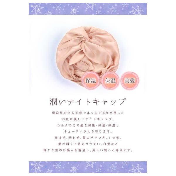 シルクの力により髪の毛を保護、保湿、保温、ダメージから髪を守ります。