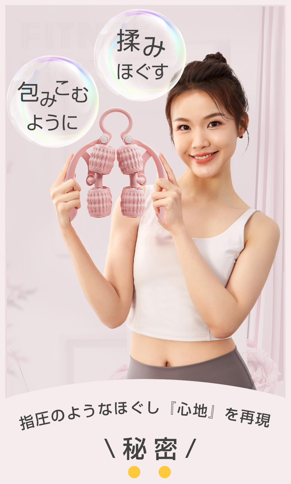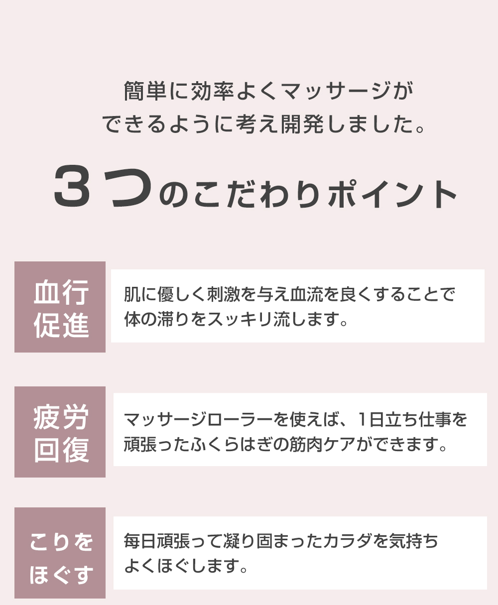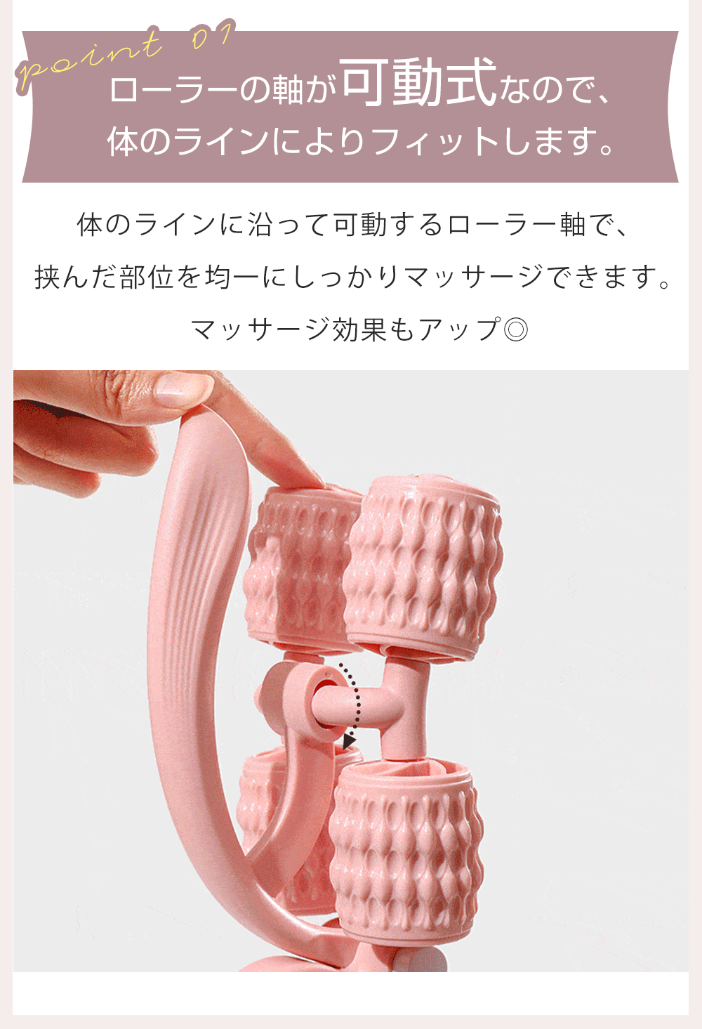 ■体のラインに沿って可動するローラー軸で、挟んだ部位を均一にしっかりマッサージできます。マッサージ効果もアップ。