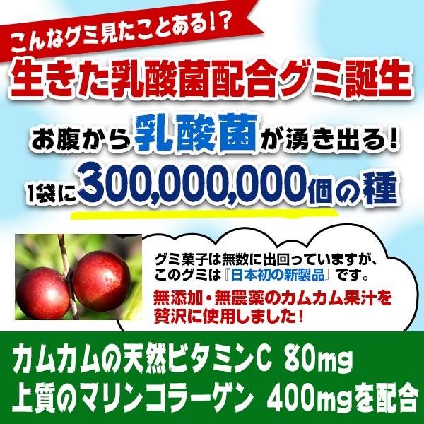 とても変わったグミが誕生しました!召し上がった後、お腹から乳酸菌が湧いてきます。1袋に3億個の種を仕込んでいます(有胞子性)。乳酸菌だけではなく、カムカムの天然ビタミンC 80mg、上質のマリンコラーゲン 400mgを配合しています!