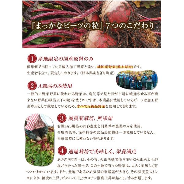 「まっかなビーツの粒」は、希少な国産(熊本県あさぎり町産)ビーツを使用した、サプリメント(錠剤)タイプのビーツです。