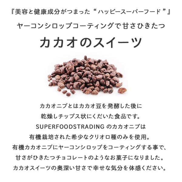 [原材料]オーガニックカカオ豆(ペルー産)、オーガニックヤーコンシロップ(ペルー製)、オーガニックカカオペースト(ペルー製)