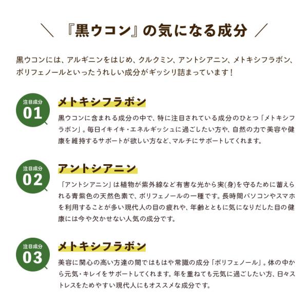 原材料名:黒ウコン末(国内製造)、マカ粉末(国内製造)/結晶セルロース、HPMC、カラメル色素