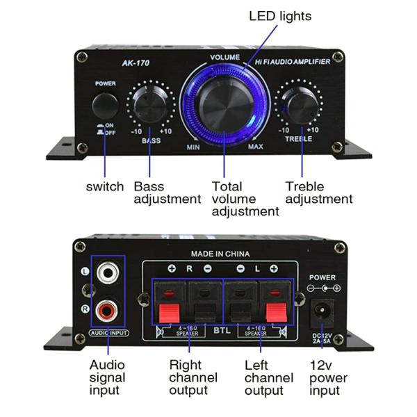 小型2chオーディオアンプ 出力20W+20W アルミボディ シンプル機能 コンパクトサイズ Hi-Fiステレオアンプ 12V/2Aアダプター付属 ミニパワーアンプ LPAK170