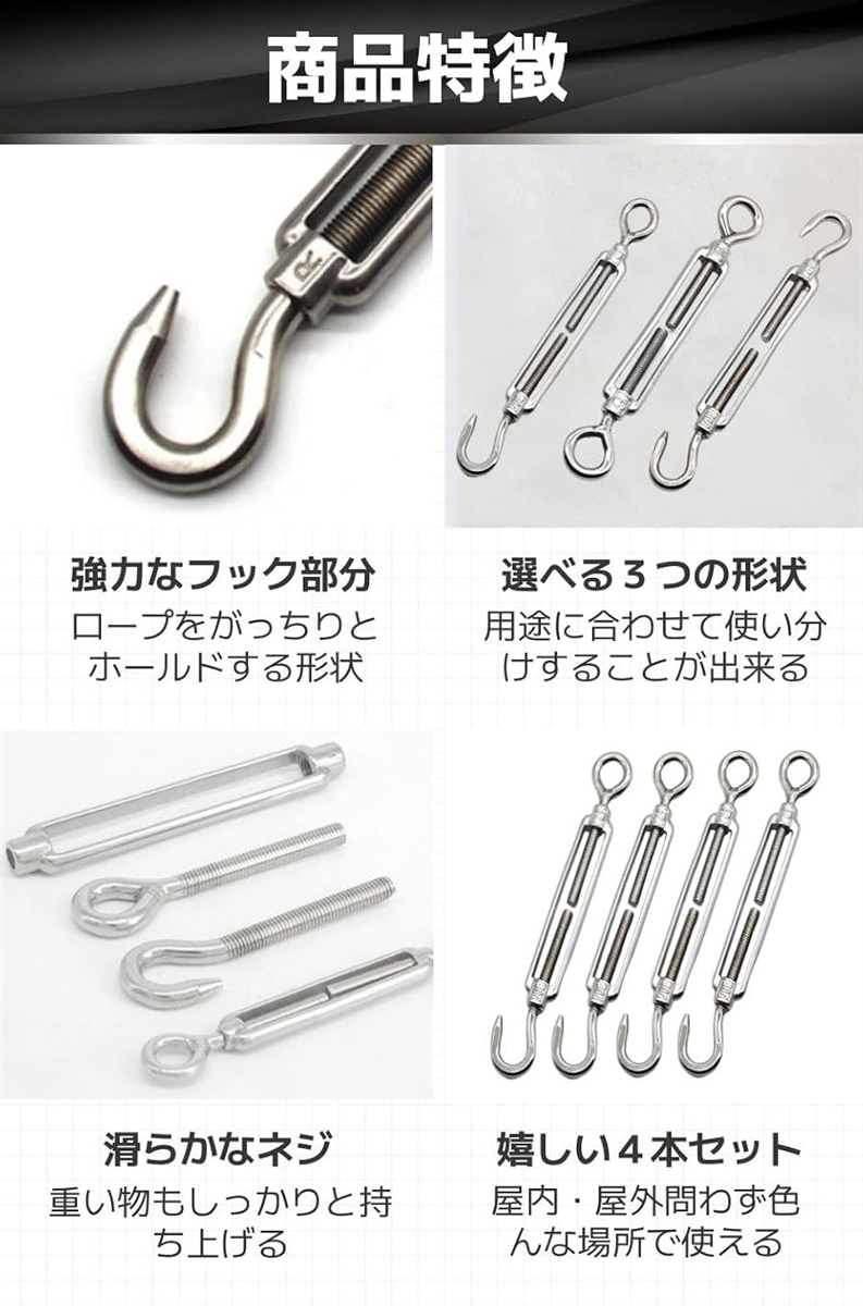 「商品特徴」(1)強力なフック部分:ロープをがっちりとホールドする形状/(2)選べる3つの形状:用途に合わせて使い分けすることが出来る/(3)滑らかなネジ:重い物もしっかりと持ち上げる/(4)嬉しい4本セット:屋内・屋外問わず色んな場所で使える