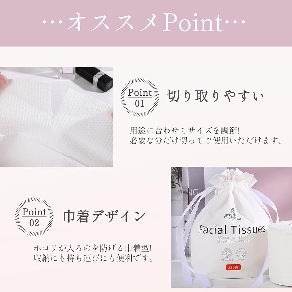 天然素材(100%植物由来コットン)を使用し、お肌への負担が少なく柔らかい、摩擦軽減、顔専用シルクタッチシート。