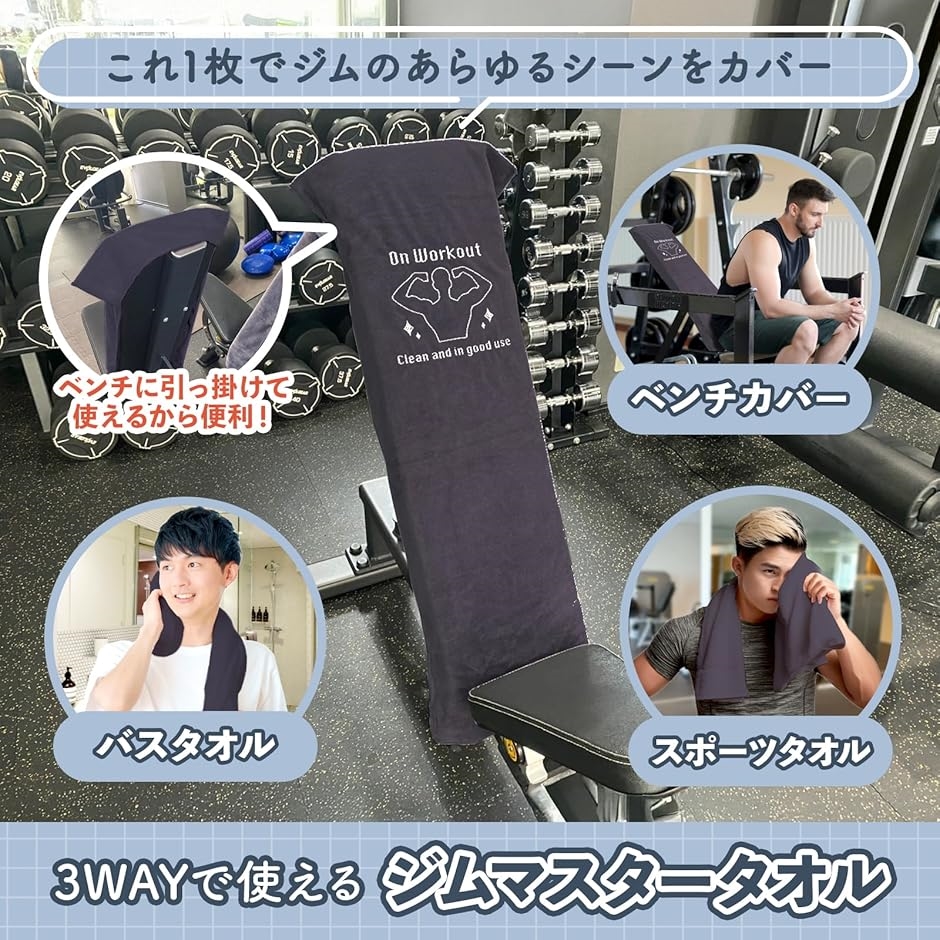 筋トレ 3WAY ジムマスタータオル マイクロファイバー スポーツタオル ベンチプレス カバー 速乾タオル(グレー, 大型)