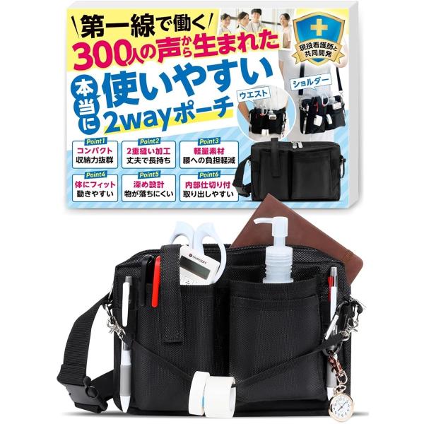 【Yahoo!ランキング1位入賞】ナースポーチ 現役看護師と共同開発ウエストポーチ 看護師ポーチ 仕事用 軽量 (ブラック, M)