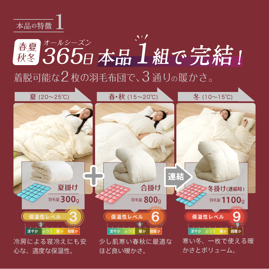 日本製 二枚合わせ 羽毛布団 シングル ライト 洗える 2枚合わせ 羽毛掛け布団 シングルロング 春 夏 秋 冬 全季節 年中使える オールシーズン 丸洗い 国産