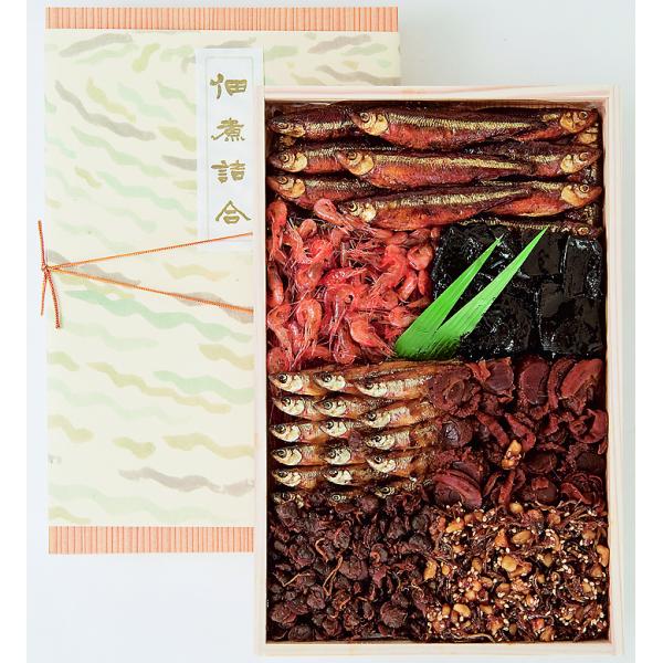 風格のある杉の重みのある箱に当店の浅煮きと言う煮詰めすぎない製法であっさり味に仕上げた佃煮をお詰め合わせしました。ここぞと言う時の贈答にもふさわしいロングセラー商品です。