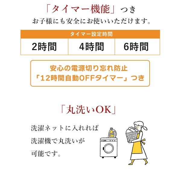 仕様:ダニ退治、室温センサー、丸洗いOK、切り忘れ防止タイマー、抗菌防臭、静電気抑制機能