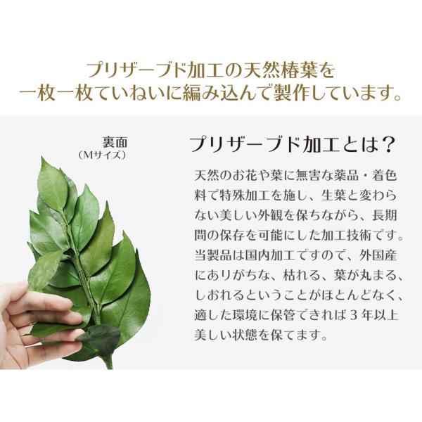 プリザーブド加工された丹波産の高級椿葉の中から、ツヤのある綺麗な葉のみを厳選使用。