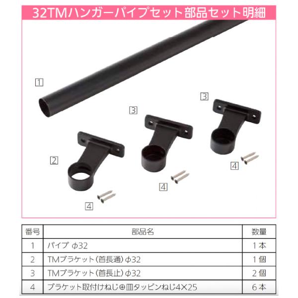 セット内容:パイプ32φ/1本、TMブラケット (首長通)φ32/1個、TMブラケット (首長止)φ32/2個、ブラケット取付けねじ+皿タッピンねじ4×25
