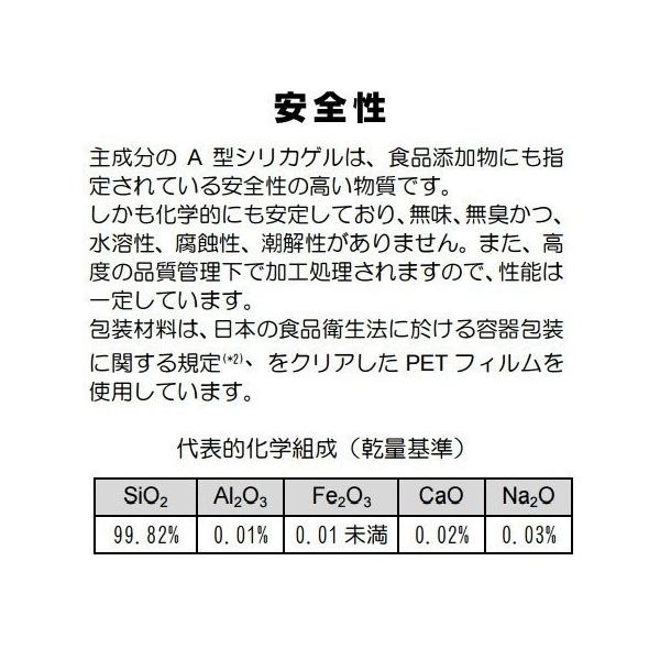 ●小さい容器への投入を容易にするコンパクトサイズです。使用する乾燥剤はA型シリカゲル。化学的に極めて安定していて、腐蝕性、潮解性、毒性がありません。食品添加物に指定されており安全性は高い。
