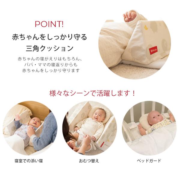・三角クッションがベビーとママ・パパとの境界を作り、安心・安全な添い寝をサポートします。