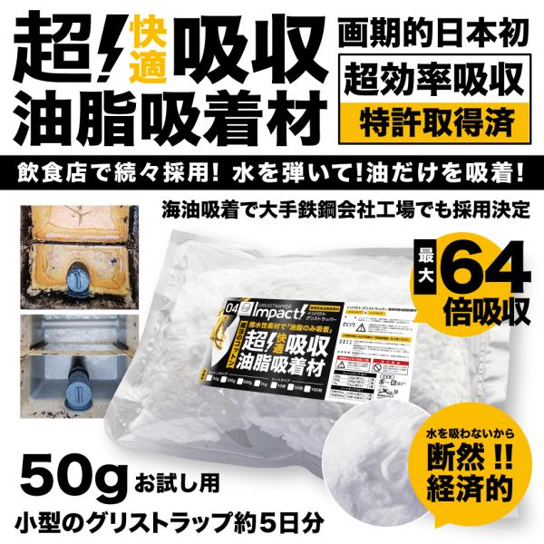 【新登場 特許取得の威力】 驚き自重の64倍吸収! 油を凄く吸う 超強力 油吸収コットン 油吸収シート グリストラップ インパクトグリストラッパー 50g