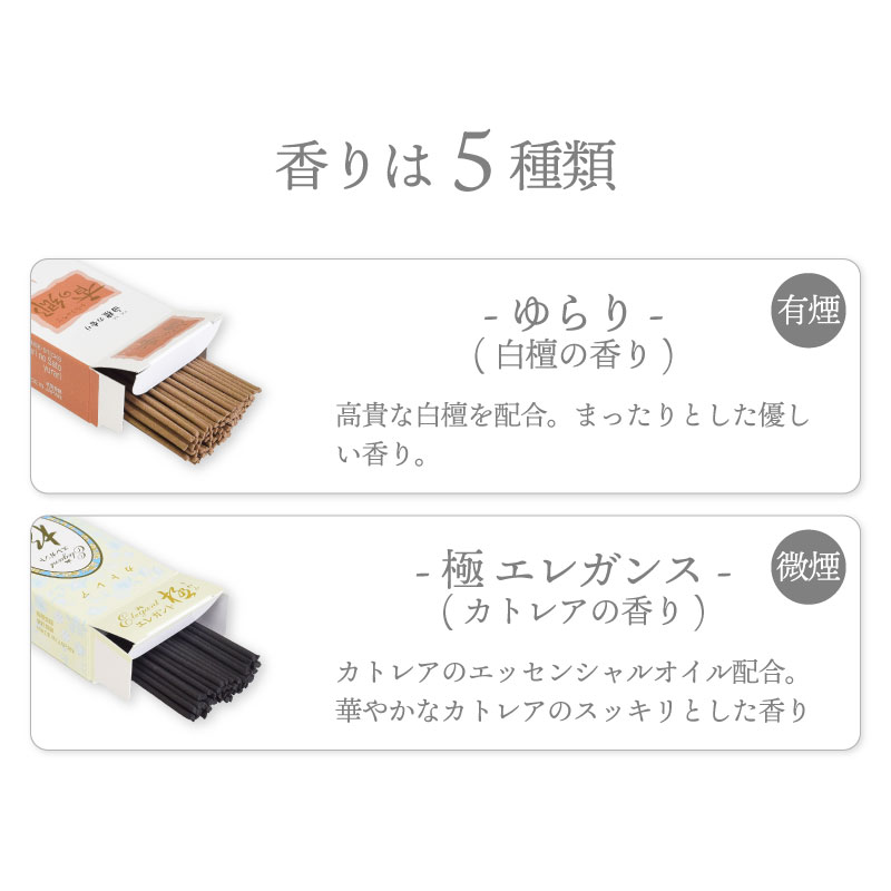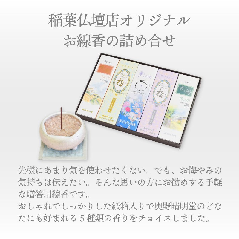 どなたにも好まれるお線香を5種類チョイスした稲葉仏壇店オリジナルの詰合せセットです。