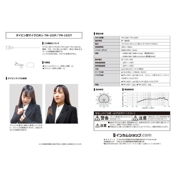 タイピン型マイクロホンTM-152Pは、講演、スピーチに適した仕様で、襟元に留めるスマートな装着感が特徴です。