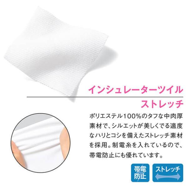ポリエステル100%のタフな中肉厚素材で、シルエットが美しくでる適度なハリとコシを備えたストレッチ素材を採用。制電糸を入れているので、帯電防止にも優れています。