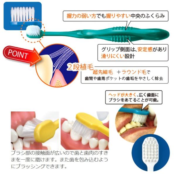 中央部のふくらみで握力の弱い方でも握りやすく、介助磨きのときでも、介護する方がボディサイドの滑り止めで、コントロールしやすいデザインです。