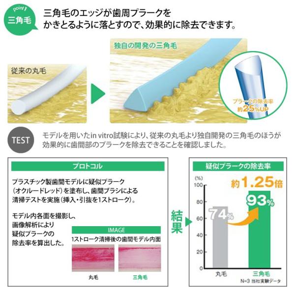 三角毛のエッジが歯周プラークをかきとるように落とすので、効果的に除去できます。
