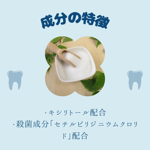成分:水、グリセリン、エタノール、PEG-60水添ヒマシ油、ポロキサマー407、サッカリンNa、香料、メチルパラベン、安息香酸Na、EDTA-2Na、キシリトール、セチルビリジニウムクロリド、クエン酸、クエン酸Na、青1
