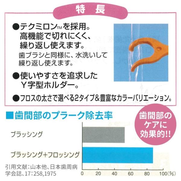 高い耐久性と操作性で繰り返し使えるY字ホルダータイプのデンタルフロスです。使いやすさを追求したY字型ホルダーで臼歯部にも使いやすく、高耐久性、低摩擦力の『テクミロン』採用で繰り返し使えます。カラフルなホルダーカラーがフロッシングタイムを楽しく彩り、フロッシングの習慣化をサポートします。