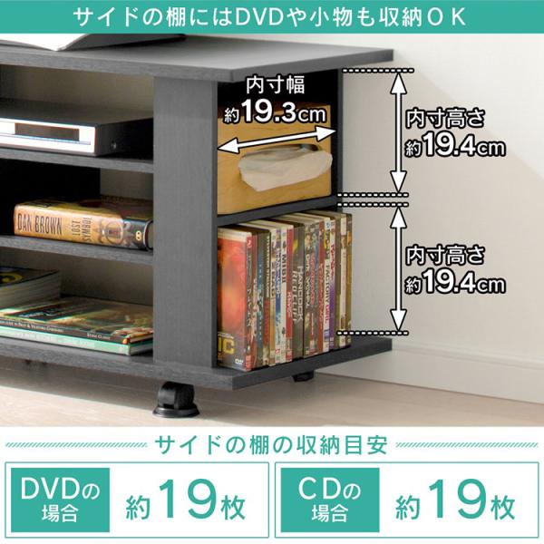 オープンタイプなので、簡単にしまったものを取り出し使用できます。サイドの棚にはDVDもしまえます。