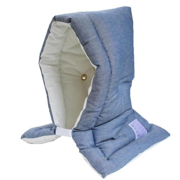 災害時に大事な頭を守ります。★ふだんはクッション座布団として使えます。学校のいすにも使えます。【地域によっては必須です】★ポリエステル綿で厚みがあります。★イス掛け用バンド付!頭巾と同色のゴム付きで、椅子からずれません。★ずきんの裏には緊急時に必要な情報を記載する名札付です。●サイズ:約30×46cm(Lサイズ)