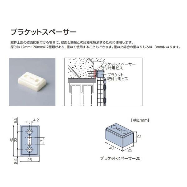 ■メーカー名:立川ブラインド工業(タチカワブラインド)■商品名:ブラケットスペーサー20■梱包数:1個入り■タチカワブラインド、シルキーのオプション部品です。■使用方法:窓枠上部の壁面に取付ける場合に、壁面と額縁との段差を解消するために使用します。