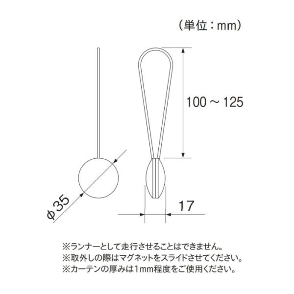 ■TOSO カーテンアクセサリー■商品名:スタイルマグネットC■カラー:イエロー・ブラウン・ホワイト・グリーン■梱包:1ケ入り■素材:ABS樹脂・マグネット・スチール■サイズ:200〜250mm(図を参考にして下さい)※ランナーとして走行させることはできません。※取外しの際はマグネットをスライドさせてください。※カーテンの厚みは1mm程度をご使用ください。