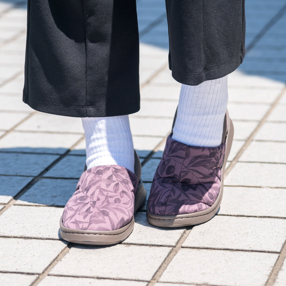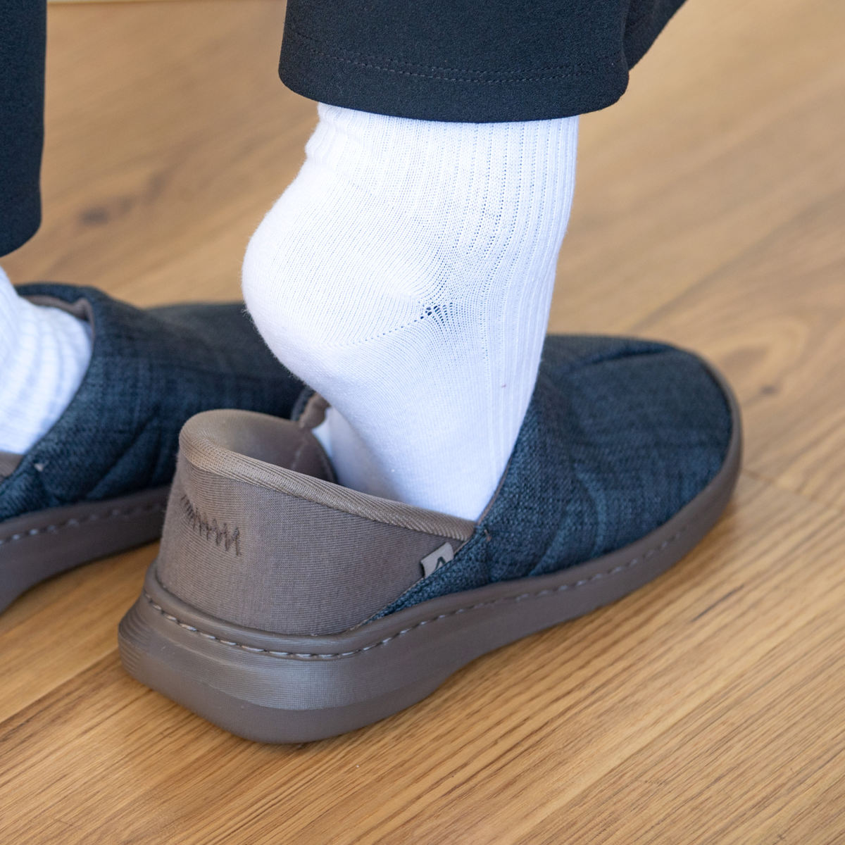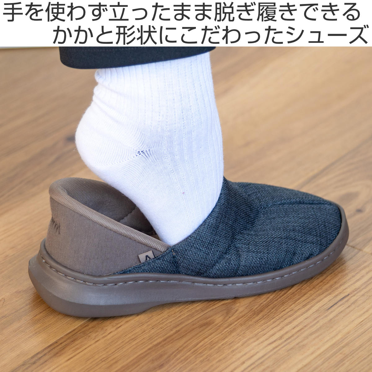 手を使わず立ったまま脱ぎ履きできる内外兼用シューズ