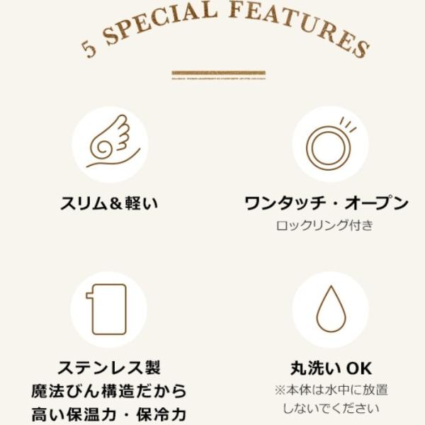 ・真空断熱構造により、冷たい飲み物・温かい飲み物ともに長時間温度を保つことができます