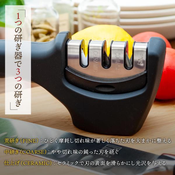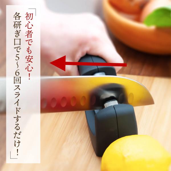 【1分で終わる簡単包丁研ぎ】包丁を各研ぎ口に差し込み、手前に5~6回程度引くだけ