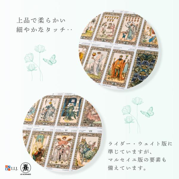 伝統的な「ライダー(ウェイト・スミス)版」と 「マルセイユ版」をもとに構成されていますので、初心者の方にも扱いやすいカードです。