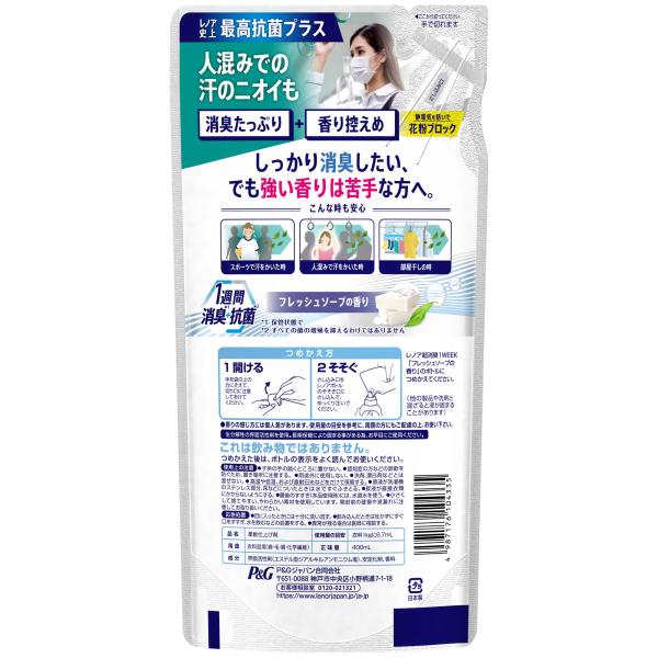 【アウトレット】レノア 超消臭 1week 消臭 たっぷり香り控えめフレッシュソープ 詰め替え 400mL 柔軟剤 消臭 部屋干し 洗濯