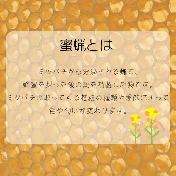 蜜蝋(ミツロウ)は蜂蜜(ハチミツ)とは別物ですが、蜂蜜を採取した後の巣が主成分ですので、
