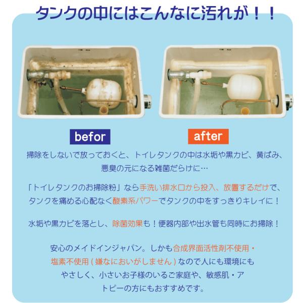 『トイレタンクのお掃除粉』なら手洗い排水口から投入、放置するだけで、トイレタンクを痛める心配もなく酸素系パワーでタンクの中をすっきりキレイに!