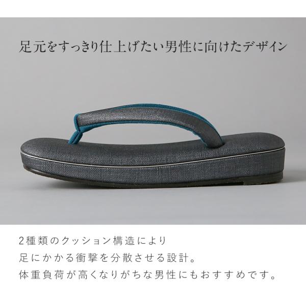 足への負担を軽減し歩きやすさを追求したIWASAの草履は、2種類のクッション構造により足にかかる衝撃を分散させる設計。体重負荷が高くなりがちな男性にもおすすめです。