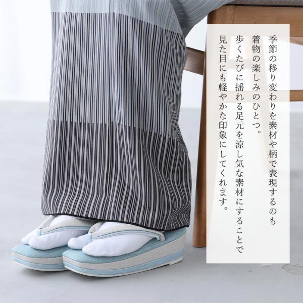 季節の移り変わりを素材や柄で表現するのも着物の楽しみのひとつ。歩くたびに揺れる足元を涼し気な素材にすることで見た目にも軽やかな印象にしてくれます。