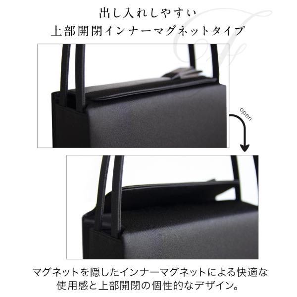 かわいらしいフォルムと出し入れのしやすさが魅力の上部開閉インナーマグネットタイプのフォーマルバッグです。