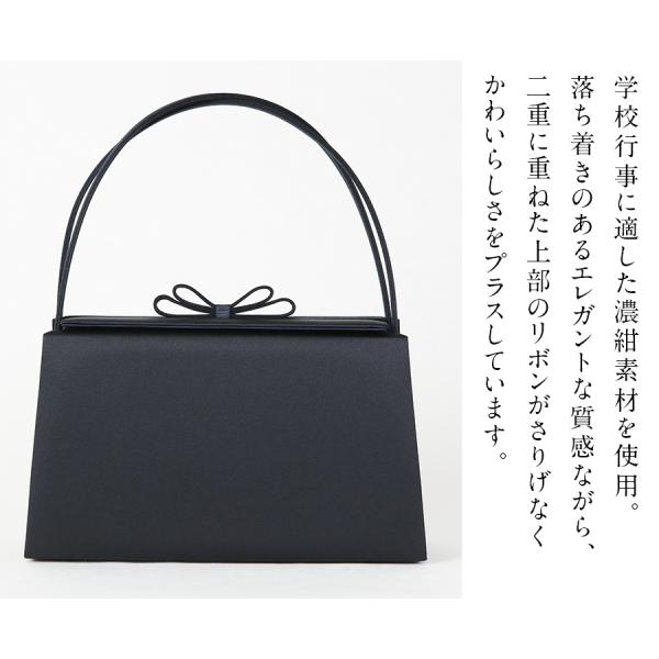 学校行事に適した岩佐オリジナルの濃紺素材を使用しており、人気の台形型で落ち着きのあるエレガントな質感ながら、芯入で二重に重ねた上部のリボンがさりげなくかわいらしさをプラスしています。